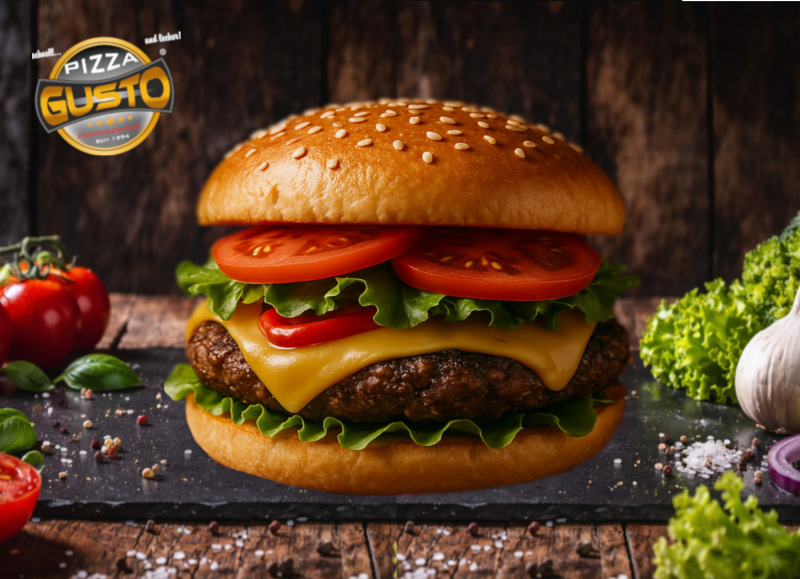 Buger mit 180g Rinderhackfl.,  Tomate, Gurke, Zwiebel, Salat, Cheddarkäse WE,EI,SE,SN,MI,19